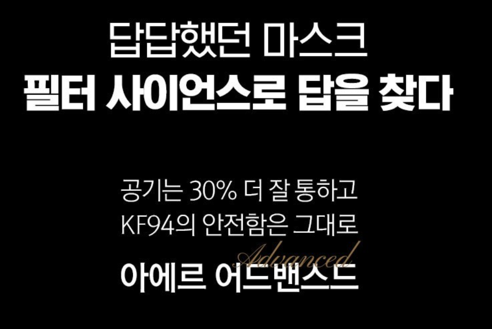 아에르에서 제조한 아에르 마스크 KF94타입은 스탠다드 베이직 소, 중, 대형으로 구성되어 있는 제품입니다. 일반적으로 사용하는 하얀색 마스크로 가장 무난하게 사용할 수 있는 타입입니다. KF 컬러 마스크로는 베이직, 그레이, 블루 색상 등도 판매를 했었는데 지금은 품절된 것으로 확인됩니다. 백색과 회색 타입이 현재는 판매되고 있습니다. KF94타입으로는 어드밴스드 보건용 마스크도 판매되고 있는데 공기가 30% 더 잘 통하게 한 장점을 갖추고 있는 것으로 홍보하고 있습니다.