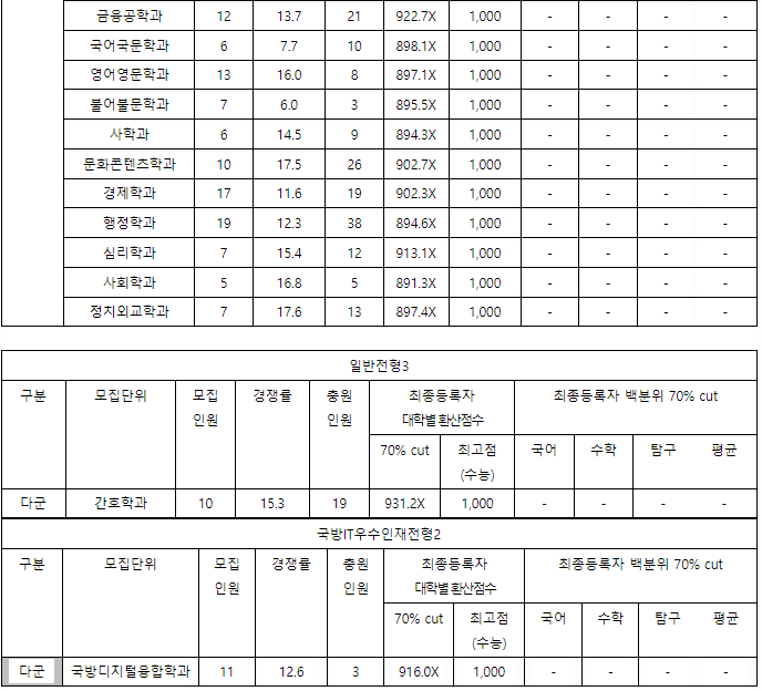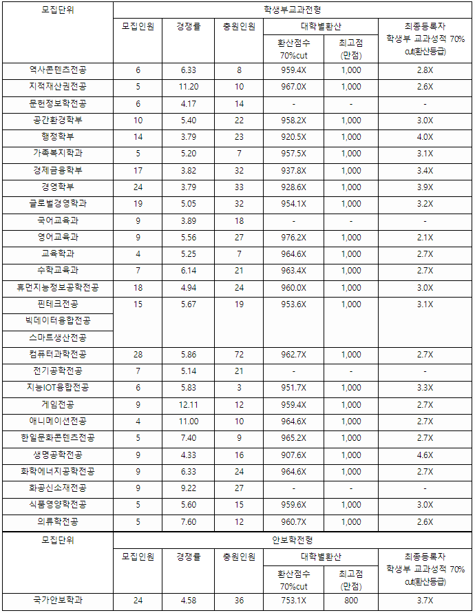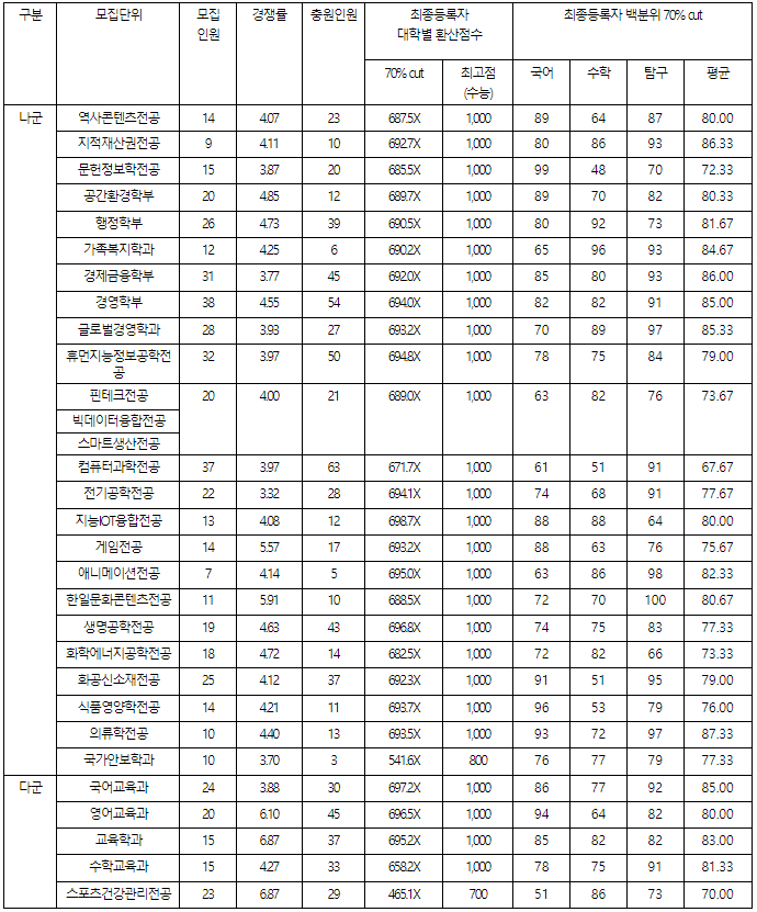 정시모집 최종등록자 백분위 평균 70% 컷입니다. 지적재산권 전공 86.33, 행정학부 81.67, 경영 85.00, 컴퓨터과학 전공 67.67, 전기공학 77.67, 게임 전공 75.67, 식품영양학 76.00, 의류학 87.33, 국가안보학 77.33, 국어교육 85.00, 교육학 83.00입니다.