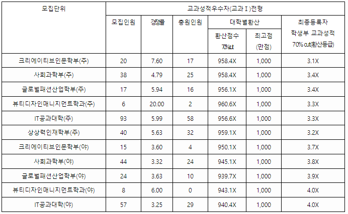 한성대 학생부 교과Ⅰ전형 최종등록자 학생부 교과 성적 70% 컷입니다. 크리에이티브 인문학 3.1, 사회과학 3.4, IT공과대학 3.3, 글로벌패션산업학부(야간) 3.9, IT공과대학(야간) 4.0입니다. 정시모집에서는 가군 상상력인재학부 백분위 평균 79.00, 다군 ICT 디자인학부 80.10, 상상력인재학부(야간) 75.00입니다.