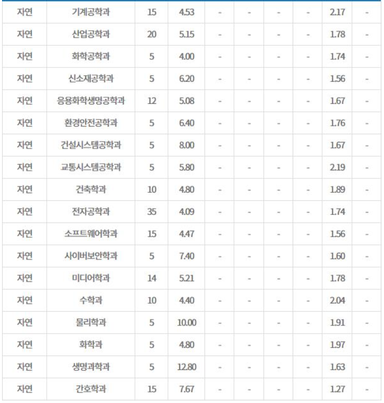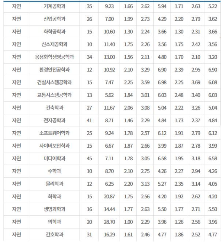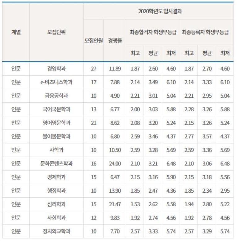 학생부 종합은 2등급 중반 대에서 3등급 초반대로 형성되어 있으며 간간히 4등급대 합격생도 있으며 특목고 출신 학생일 것으로 추정됩니다. 인문계에서 가장 평균 등급이 높은 전공은 행정학과 2.34이며 불어불문학과는 3.57로 가장 낮았습니다. 자연계에서는 응용화학생명공학과가 2.10으로 가장 높으며 건설시스템공학과로 3.69입니다. 학생부 종합 전형에서의 수시 등급은 절대적인 요소는 아니며 다양한 학교 활동, 자기소개서, 면접 등에서 당락이 결정됨에 유의해야 합니다.