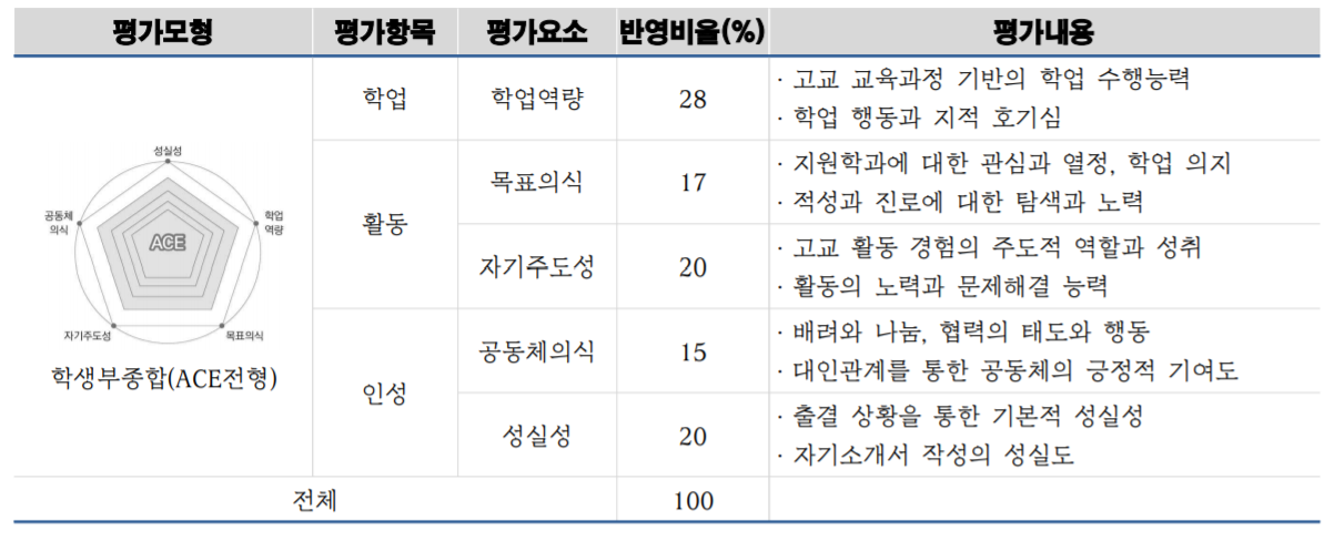 학생부종합 ACE전형는 학생부와 자기소개서 서류 100% 1단계 전형을 실시하여 3배수를 선발하고 2단계에서 1단계 성적 70%, 면접 30%의 비중으로 최종 합격자를 선발합니다. 평가항목은 학업역량 28%, 자기주도성 20%, 성실성 20%, 목표의식 17%, 공동체 의식 15%의 비율로 평가합니다.
