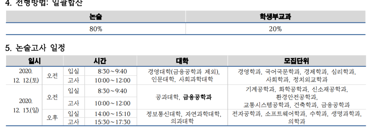 논술전형은 논술 80%, 학생부 20% 일괄 전형입니다. 수능최저기준은 없지만 의학과 지원자는 국어, 수학가, 영어, 과학 중 2과목 평균 합이 5이내여야 합니다.
