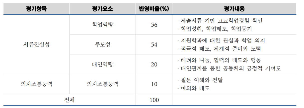 학생부종합 ACE전형는 학생부와 자기소개서 서류 100% 1단계 전형을 실시하여 3배수를 선발하고 2단계에서 1단계 성적 70%, 면접 30%의 비중으로 최종 합격자를 선발합니다. 평가항목은 학업역량 28%, 자기주도성 20%, 성실성 20%, 목표의식 17%, 공동체 의식 15%의 비율로 평가합니다.