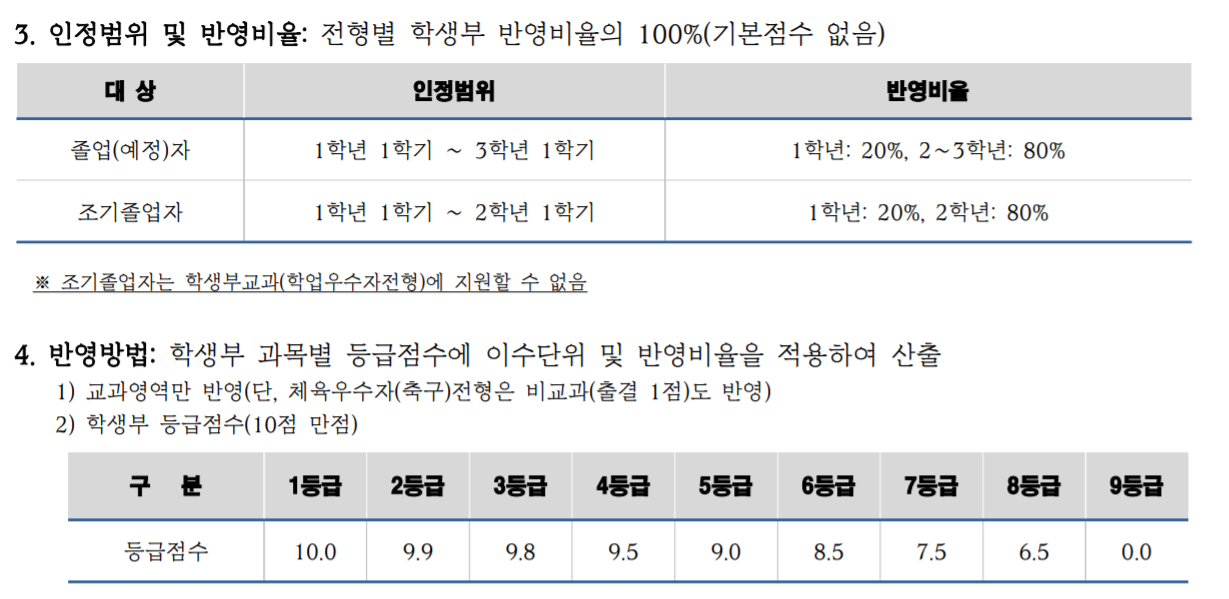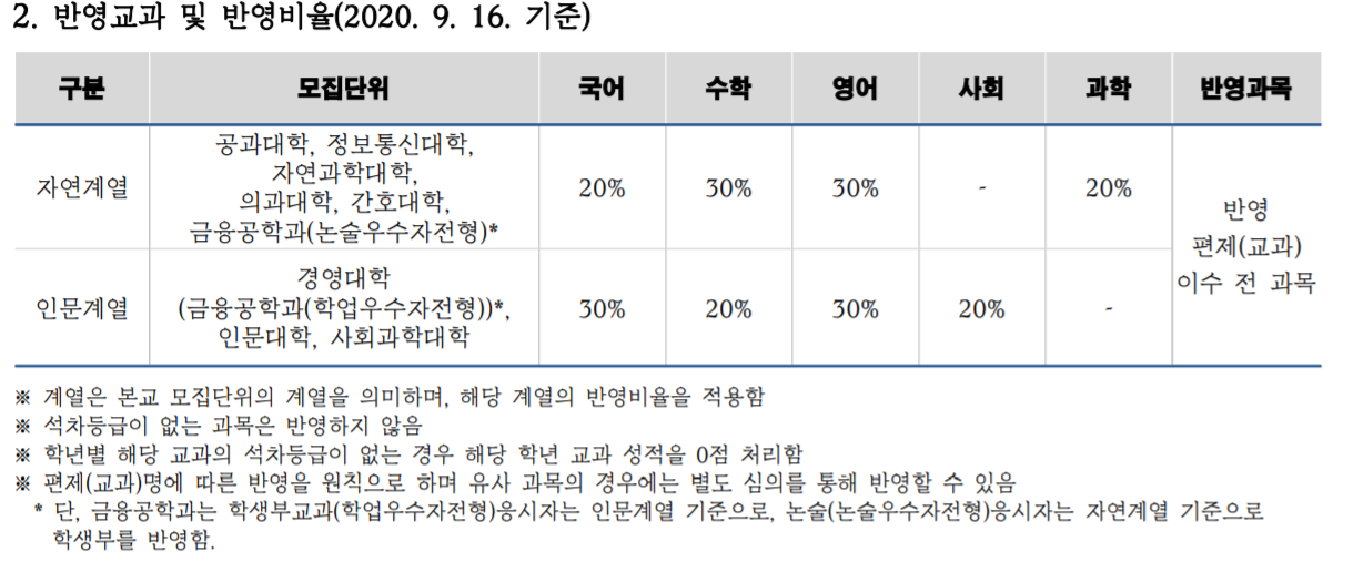 학생부 교과 전형은 학생부 교과 100% 일괄 선발입니다. 교과 성적을 정량 평가하며 면접, 자기소개서 제출은 없습니다. 인문계열은 국어 30%, 수학 20%, 영어 30%, 사회 20% 반영이며 자연계열은 수학 30%, 과학 20% 반영의 차이가 있다.