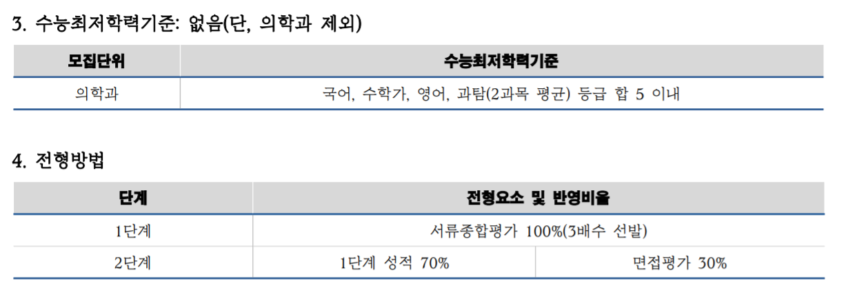 논술전형은 논술 80%, 학생부 20% 일괄 전형입니다. 수능최저기준은 없지만 의학과 지원자는 국어, 수학가, 영어, 과학 중 2과목 평균 합이 5이내여야 합니다.