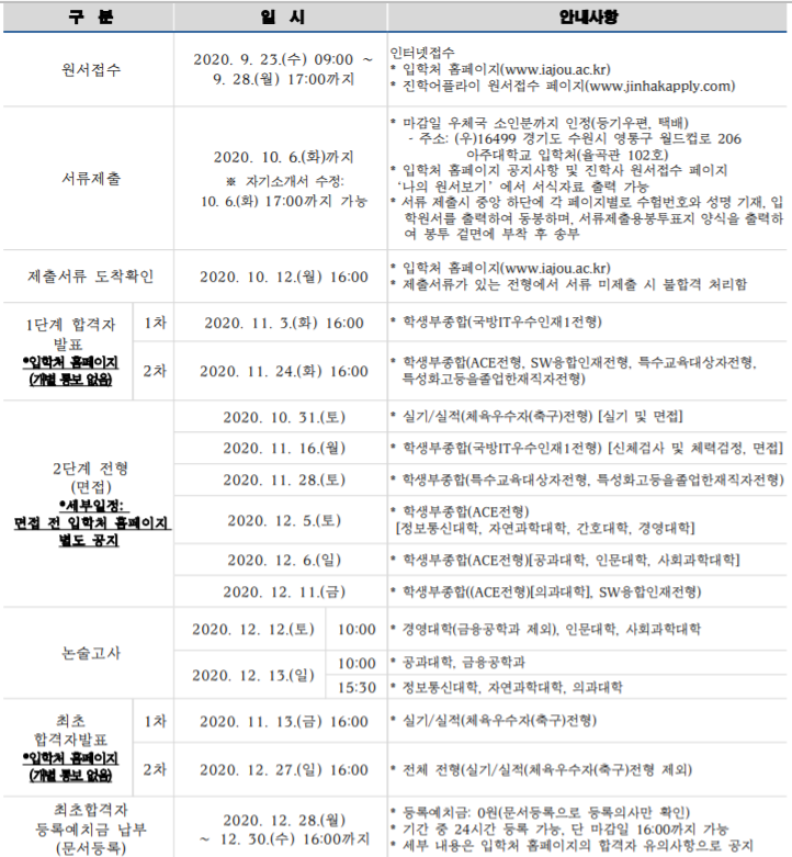 아주대 수시모집 인터넷 원서접수일정은 9월 23일부터 28일까지입니다. 학생부 종합 1단계 합격자 발표일은 11월 24일이며 2단계 면접은 전형에 따라 10월 31일부터 12월 11일까지 실시됩니다. 논술고사는 12월 12,13일 실시되며 최종 합격자 발표일은 12월 27일 예정입니다.