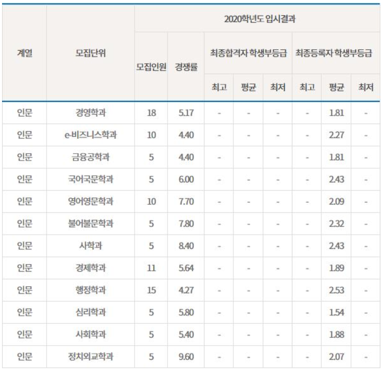 학생부 종합은 2등급 중반 대에서 3등급 초반대로 형성되어 있으며 간간히 4등급대 합격생도 있으며 특목고 출신 학생일 것으로 추정됩니다. 인문계에서 가장 평균 등급이 높은 전공은 행정학과 2.34이며 불어불문학과는 3.57로 가장 낮았습니다. 자연계에서는 응용화학생명공학과가 2.10으로 가장 높으며 건설시스템공학과로 3.69입니다. 학생부 종합 전형에서의 수시 등급은 절대적인 요소는 아니며 다양한 학교 활동, 자기소개서, 면접 등에서 당락이 결정됨에 유의해야 합니다.
