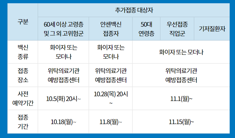 얀센 백신 접종자 부스터 샷 대상자는 18세 이상으로 접종후 2개월 이후부터 가능합니다. 대상자들에게는 안내 문자가 전송되었을 것입니다. 1차 예약 기간은 10월에 마무리되어 11월 8일부터 12월 31일까지 접종이 진행되며 2차 예약 기간은 10월 30일부터 시작되어 12월 2일까지 진행되며 접종 기간은 11월 15일부터 12월 31일까지입니다.