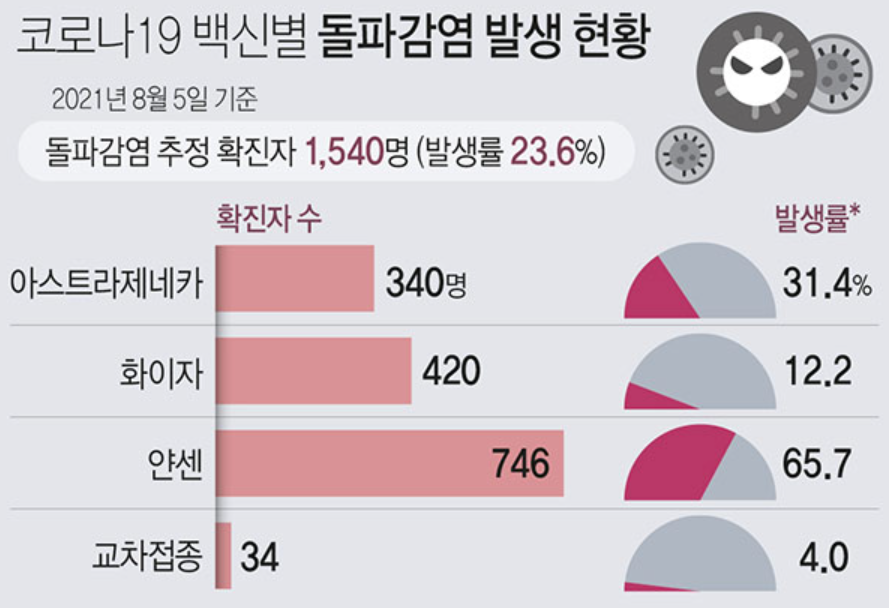 코로나 백신 중 하나인 얀센 백신은 유일하게 1회 접종으로 끝나는 백신이었는데 그래서인지 몰라도 화이자, 모더나, 아스트라제네카 같이 2회를 맞는 백신과 비교하면 효능이 떨어지지 않나 하는 의구심이 있었는데 접종후 코로나에 감염되는 돌파 감염 사례가 다른 백신보다 월등히 많다는 통계 자료가 있는 것을 보면 사실로 보입니다.