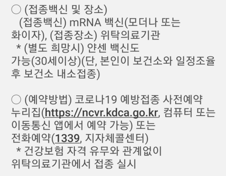 예약은 질병관리청 예방접종 사전 예약 시스템(https://ncvr2.kdca.go.kr/)으로 접속하여 본인 확인 절차를 진행하고 예약 일자, 시간, 의료 기관을 찾아 선택하고 예약을 진행하면 됩니다. 모더나 또는 화이자 백신인데 수급 사정에 따라 종류가 확정되는 점 참고하시기 바랍니다.