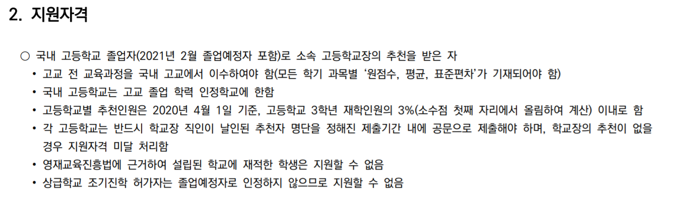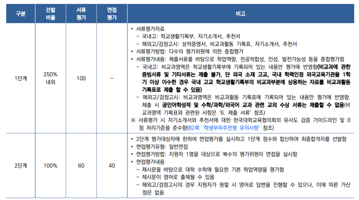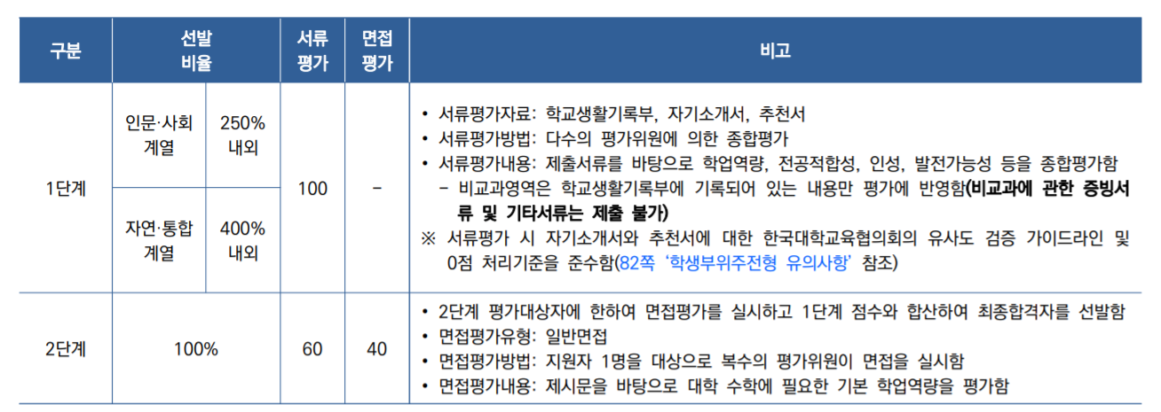 면접형은 지원자격에 제한이 있어 고등학교 3학년 재학인원의 3%(성적) 이내의 학생으로 학교장의 추천을 받아야 합니다. 서울대 지역균형 선발, 고려대 학교추천과 유사하다고 볼 수 있겠습니다. 추천 전형 성격이 강한 전형으로 이해하시면 되겠습니다. 면접형의 학생부 교과에서는 Z점수 50%, 교과 등급 50%를 반영하므로 일반고 학업 우수학생들에게 다소 불리할 수도 있음을 감안해야 합니다.