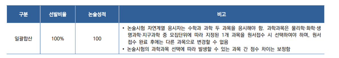 논술전형은 2020년 607명에서 384명으로 대폭 줄인 것이 특징입니다. 논술성적 100%로 선발하며 수능최저기준도 없어 지원자가 많이 몰릴 것으로 예상되는데 그만큼 엄청난 경쟁률이 예상되어 합격을 예측하기 어려운 전형입니다. 자연계의 경우 전공과목과 시험과목을 일치시킨 것이 특징입니다.