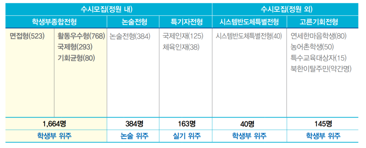 연세대학교 서울 신촌 캠퍼스를 위주로 알아보겠습니다. 정원내 수시모집 전형에서 서류 위주인 학생부 종합전형으로 1,664명, 논술 위주인 논술 전형으로 384명, 실기위주인 특기자 전형으로 163명을 선발합니다. 참고로 정시모집 인원은 전년보다 148명이 증가되어 1,284명입니다.
