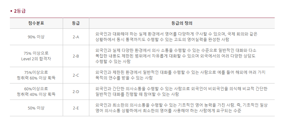 종합적인 부분을 평가하는 시험으로 현재 공무원 영어 시험에서 인정되는 급수는 2등급 이상입니다. 4지 선다형으로 출제되며 기본기에 충실하고 실질적인 영어 구사 능력을 갖추고 있다면 무난하게 급수를 받을 수 있는 테스트입니다. 공무원 시험 자격을 갖추기 위해서는문법, 청취, 독해, 어휘 항목별로 65%이상을 득점하면 됩니다.