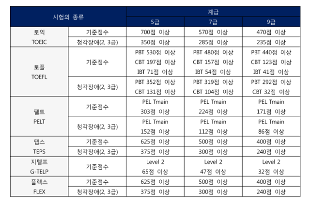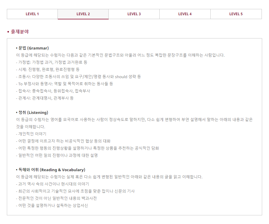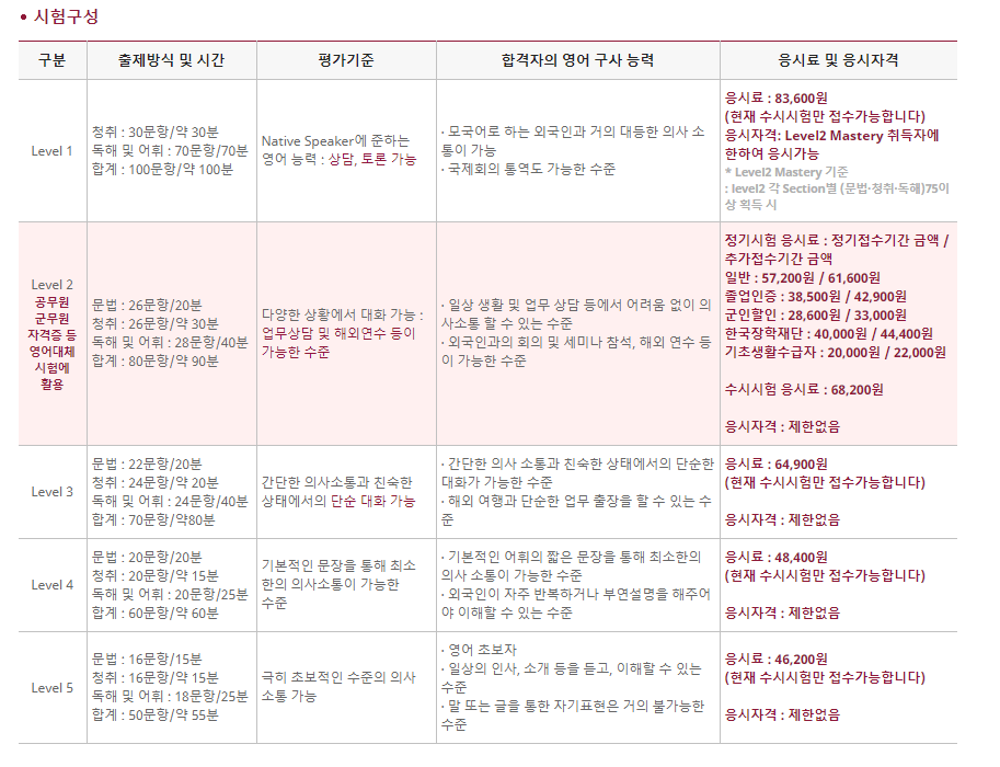 종합적인 부분을 평가하는 시험으로 현재 공무원 영어 시험에서 인정되는 급수는 2등급 이상입니다. 4지 선다형으로 출제되며 기본기에 충실하고 실질적인 영어 구사 능력을 갖추고 있다면 무난하게 급수를 받을 수 있는 테스트입니다. 공무원 시험 자격을 갖추기 위해서는문법, 청취, 독해, 어휘 항목별로 65%이상을 득점하면 됩니다.