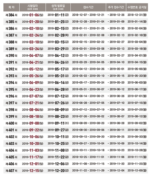 2019년 현재 남은 일정은 10.20일부터 약 2주 간격으로 치뤄지게 되며 총 5회의 일정이 남아 있습니다. 자세한 일정은 표를 확인하시기 바랍니다. 응시료는 정기시험 기준 57,200원입니다.