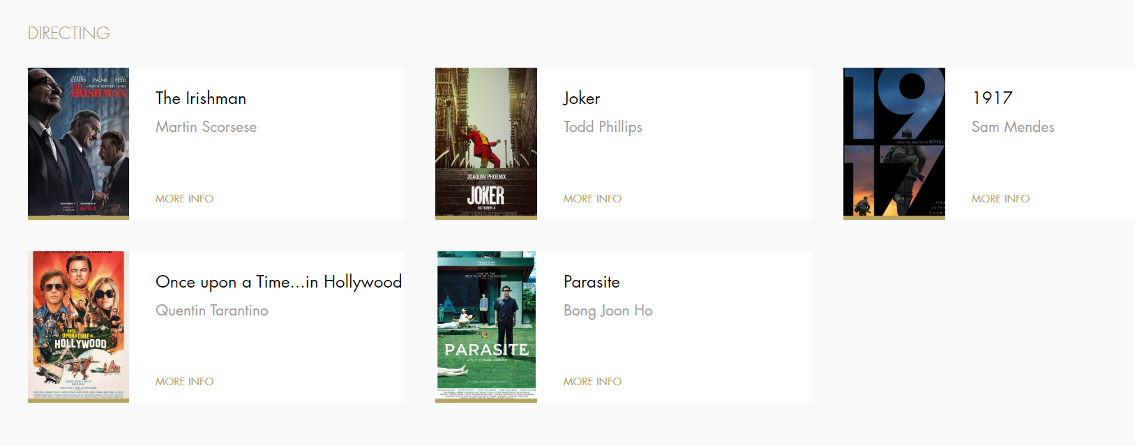 아카데미 본 상 시상식에서는 총 25개 부문의 상이 있습니다. 작품상은 보통 5개 정도의 후보가 경쟁하는 다른 부문과 비교하면 경쟁 후보도 9개나 되고 하이라이트인 만큼 시상식에서도 제일 나중에 호명되는 상입니다. 전년에 발표되었던 수많은 영화들 중 후보로 선정되는 것만으로도 대단한 것이며 실제 한국 영화 사상 작품상 후보에 올라온 작품은 영화 기생충이 유일합니다. 이번에 후보로 올라 왔던 작품들은 영화 기생충 외에 가장 강력한 경쟁작이었던 ‘1917’, ‘조커’, ‘조조래빗’,’아이리쉬맨’,’작은 아씨들’,’결혼이야기’,’포드VS페라리’,’원스어판어타임인 헐리우드’ 등이었습니다.