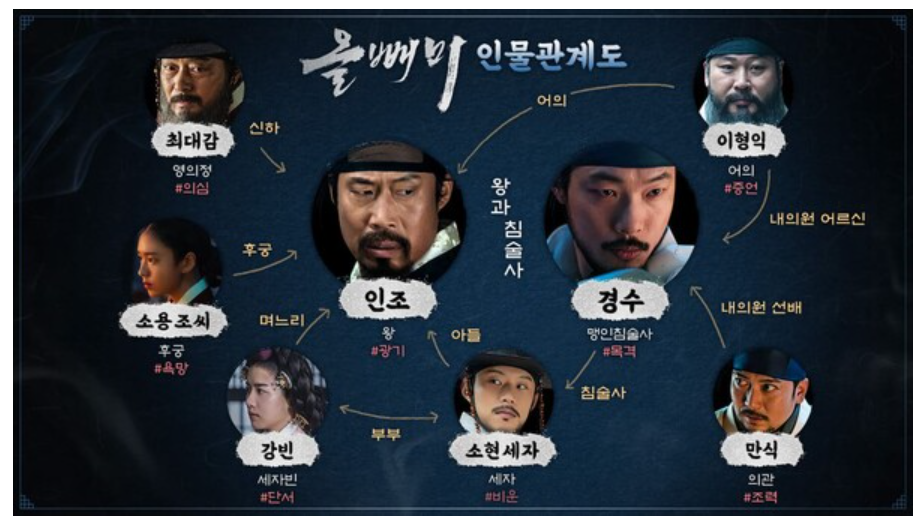 남한산성에서 치욕적인 패배를 당하며 무릎을 끓고 내려온 인조는 가장 치욕적인 왕으로 기록되는 인물입니다. 본시 왕의 자리에 있으며 안될 인물로 중립적인 외교를 펼치며 안정적인 국제 관계를 이어가기는 했지만 기반이 취약했던 광해군을 끌어 내리고 그 자리에 앉은 왕이 인조입니다. 병자호란에서 패하며 아들 소현세자는 청나라로 인질을 가게 되었는데 그가 돌아오자 반가워 하기는 커녕 치욕이 되살아나서였는지 그를 냉대하고 결국 두달만에 세자는 급사를 하게 됩니다. 더욱이 세자는 청나라에서 보고 배운 지식을 나라의 발전에 보태고자 하였으나 그저 못마땅한 인조에게는 그럴 생각이 전혀 없었으며 급기야 세자가 죽은 것입니다. 청나라에 치욕을 당한 왕, 그런 청나라에서 들어와 새문물을 전하려는 아들을 싫어하는 왕, 그리고 알 수 없는 병으로 죽고 마는 세자, 그 시대 사람들이 생각하기에도 인조는 많은 의심을 받았을 것 같습니다. 그의 죽음에 대해서 인조실록은 이렇게 기록하고 있습니다. ‘세자는 본국에 돌아온 지 얼마 안 되어 병을 얻었고 병이 난 지 수일 만에 죽었는데, 온 몸이 전부 검은 빛이었고 이목구비의 일곱 구멍에서는 모두 선혈이 흘러나오므로, 검은 멱목으로 그 얼굴 반쪽만 덮어 놓았으나, 곁에 있는 사람도 그 얼굴 빛을 분변할 수 없어서 마치 약물에 중독되어 죽은 사람과 같았다.’ 이렇게만 봐도 원인을 알 수 없는 돌연사로 보이는데 인조가 행항한 전후 상황을 보면 의도가 개입된 독살에 더 무게가 실리고 있습니다. 이 영화는 이렇게 소현세자의 독살을 둘러싼 이야기를 다루고 있습니다.