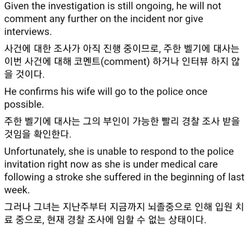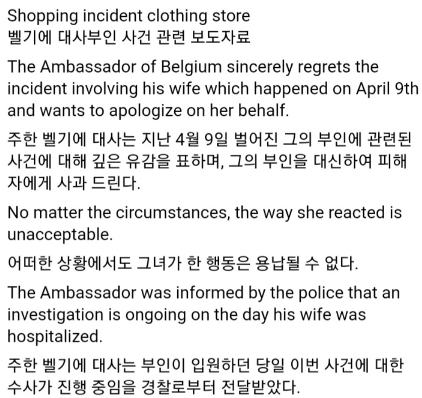 사건이 벌어진 날이 4월 9일이었는데 경찰의 조사를 받은 것은 5월 6일이었으니 거의 한달 가까이 지나 마지못해 나왔던 것입니다. 그리고 경찰은 벨기에 대사관에 공문을 보내어 면책특권 포기 여부를 문의하였는데 이는 현행 국제법상 '외교관계에 관한 빈 협약'에 따라 외교관과 그 가족에게 주재국의 형사처분 절차를 면제 받는 권한이 있는 절차에 따른 것입니다. 벨기에 대사관은 사건이 터진후 대사의 성의없고 형식적인 사과를 통하여 수사에 적극 협조하겠으며 부인의 행동은 용납할 수 없다는 입장을 밝히기도 했는데 예상대로 면책특권을 포기하지 않겠다는 공식 입장을 밝혔습니다.