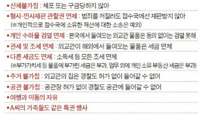 외교관은 접수국에서 범죄를 저지르더라도 어떤 형태의 체포 또는 구금도 당하지 않으며(빈 협약 29조,. 현장에서 외교관 신분이 확인되면 연행되지도 않습니다. 이는 외교관들의 가족도 똑같이 적용 받게 됩니다. 벨기에 대사 부인은 바로 이 면책특권을 받고 있는 것입니다. 외교관들에게 주어지는 면책 특권 범위 몇 가지를 더 보면 형사, 민사재판 관할권 면제(재판을 받지 않음), 개인 수하물 검열 면제, 관세 및 조세 면제, 세금 면제, 주거 및 공관 불거침이 있어 경찰이 허락없이는 못들어가며 여행과 이동의 자유가 있습니다.