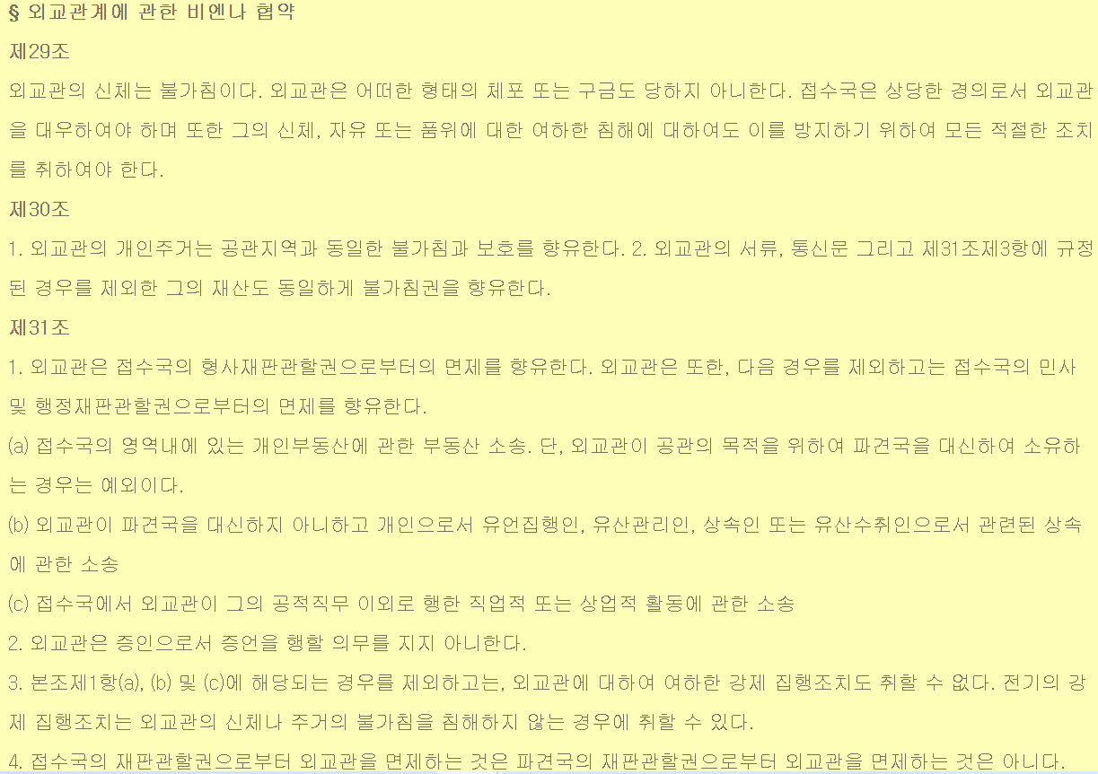 주재 외교관은 상대국에서 국가를 대표하는 업무를 수행하는 사람들입니다. 이들은 특별 대우를 받게 되는데 1961년 제정된 빈 협약에 따라 특별한 면책 특권을 받고 있습니다. 여러 가지가 있지만 이중에서도 가장 특별한 것은 ‘신체불가침’입니다.