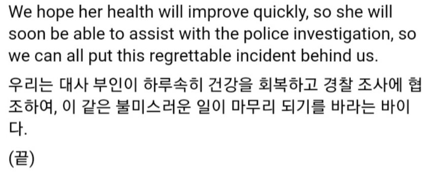 폭행 사건을 간단히 보면 옷가게에서 옷을 입어보던 대사 부인은 구매는 하지 않고 매장을 나갔는데, 부인이 입고 있던 옷이 매장에서 취급하던 제품과 같아 직원이 따라가서 확인을 하고 매장 제품이 아닌 것을 알고 죄송하다는 사과를 한 후 매장 카운터로 돌아왔으나 화가 난 이 여성이 다시 돌아와 매장 점원의 뺨을 때린 사건입니다.