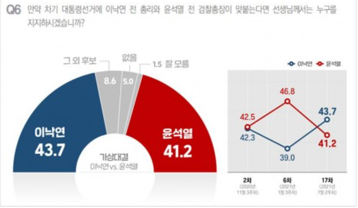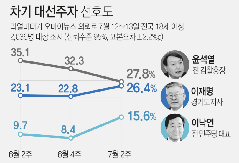 아시아경제가 윈지코리아컨설팅에 의뢰하여 7월 9일부터 11일까지 조사한 결과를 보면 차기 대선 후보자들의 지지율은 윤석열 26.4%, 이재명 지사 25.8%로 여전히 양강을 형성하고 있습니다. 다음으로는 이낙연 전 대표 16.4%, 홍준표 국민의 힘 의원 4.8%, 추미애 전 법무부 장관 4.7%, 최재형 전 감사원장 4.1% 순이었습니다. 윤석열 전 총장의 지지율이 이제 30%대가 무너지며 20%대로 내려왔고 이재명 지사와의 격차도 좁혀졌음을 볼 수 있습니다.