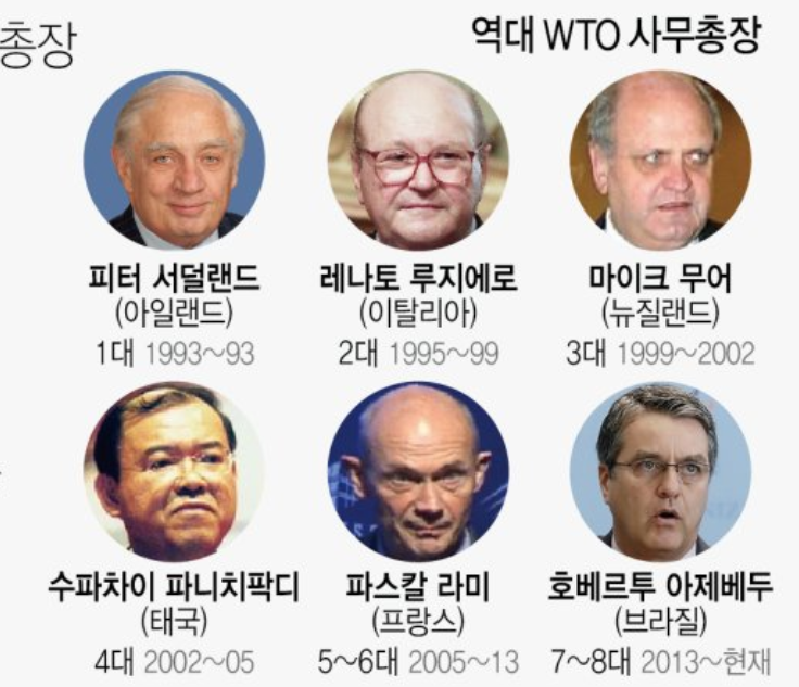 1995년부터 지금 현재까지 사무총장으로 임명되었던 사람은 6명이었습니다. WTO 출범이전의 피터 서덜랜드, 초대 총장은 이탈리아의 레나토 루지에로 였으며, 2대 뉴질랜드 출신의 마이크 무어, 3대 태국의 수파차이 파닛차팍, 4대 프랑스 파스칼 라미, 현재 5대 사무총장인 브라질의 호베르토 아제베두까지 내려오고 있습니다. 미국과 중국의 무역 분쟁이 심화되고 트럼프가 WTO의 무력화를 시도하고 있는 와중에 현 사무총장이었던 호베르토 아제베두 사무총장은 5월 14일에 사퇴를 선언하고 물러나겠다고 선언했습니다. 그는 2013년부터 사무총장으로 재임하여 현재까지 7년째였습니다. 정확한 사유는 밝혀진 것은 없으나 미국의 비협조와 압박이 주된 이유였을 것으로 추정됩니다. 임기는 내년 8월까지였는데 1년여를 남겨두고 물러나는 것입니다.