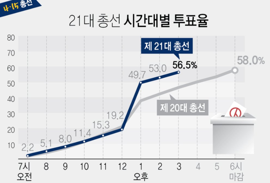 21대 총선이 순조롭게 진행되고 있습니다. 16시 현재 전국 투표율은 59.7%를 기록하며 이미 20대 총선 58.0%를 넘어 섰습니다. 이제 두 시간이 지나면 투표가 종료되는데 최종 투표율은 대략 65~67% 정도로 예상합니다.