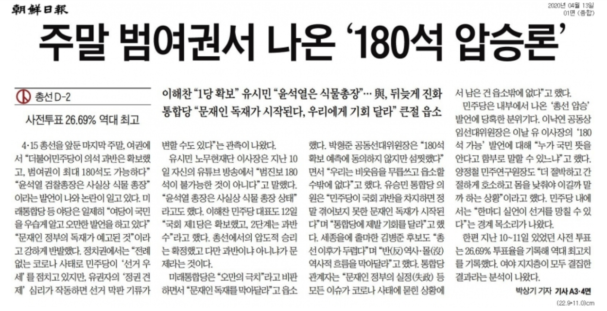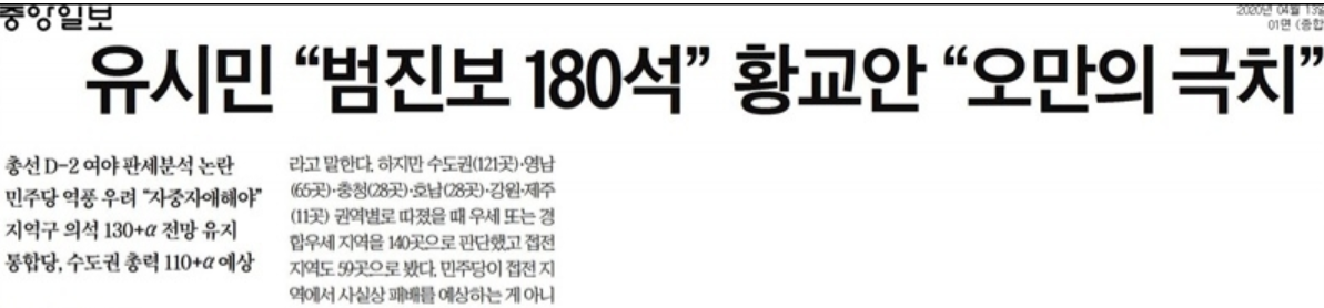 아무리 내용을 다시 들어봐도 유이사장은 민주당 180석은 확실하다는 말은 한 적이 없습니다. 다만 180석은 받았으면 좋겠는데, 진보 진영을 모두 합한다면 180석이 불가능한 것도 아니다 라는 내용인데, 이것을 보수 야당에서는 범여권이 180석 확보를 호언한 것이라며 공세를 취한 것인데 좀 많이 간 것 같습니다. 말 한마디 놓치지 않고 공세로 활용하는 정치세력의 전형을 보는 것 같습니다.
