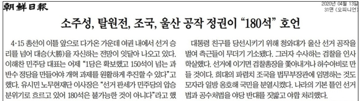 또한 조중동 같은 보수 언론은 이 발언을 1면에 싣고 사설까지 써대며 황교안 대표의 발언 ‘오만의 극치’, ‘오만한 여당’ 같은 내용으로 대서 특필하기 까지 합니다. 그러면서 여당이 180석을 달성하게 되면 국회선진화법도 무너지고 나라의 근본이 무너질 거라며 그들의 속내를 비친 바 있습니다.
