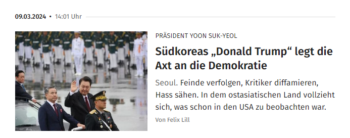 독일의 유력 일간지인 베를리너모르겐포스트는 3월 9일(현지시간) '한국의 도널드 트럼프가 민주주의에 도끼를 놓고 있다'는 제목의 기사를 올리면서 윤석열 정권을 비판하고 있습니다. 기사를 작성한 이는 독일 출신 동아시아 전문 기자인 펠릭스 릴이며, 윤석열 대통령이 한국의 민주주의를 위협하고 훼손하고 있다는 취지의 내용입니다. 한국의 윤석열을 미국의 트럼프와 비교하고 있는데 이 정도로 한국의 민주주위가 위기에 처해 있음을 보여주고 있습니다.