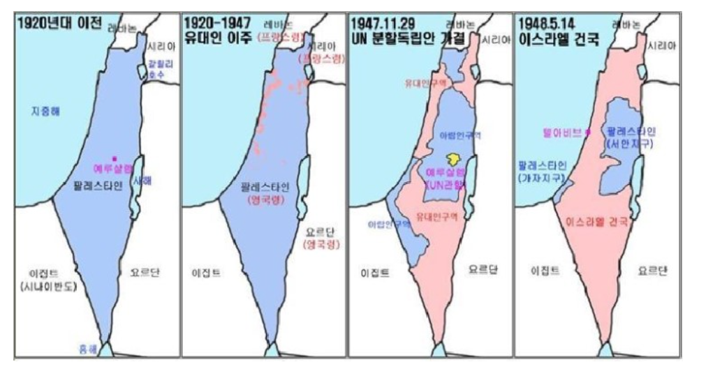 벨푸어 선언이 나온 이후 많은 유대인들이 팔레스타인 지역으로 몰려들기 시작했고 갈등이 시작되었습니다. 1920년대 이전에는 팔레스타인 사람들이 살던 이 땅에 유대인들이 몰려들기 시작하며 1947년까지 약 27년간 이주가 계속되었습니다.