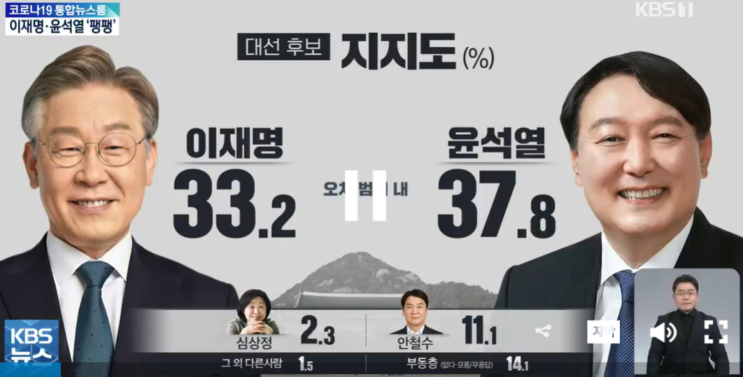 KBS가 한국리서치에 의뢰하여 1월 27일부터 29일까지 실시한 내용을 살펴 보겠습니다. 해당 조사는 전국에 거주하는 만 18세 이상 남녀 1천명을 대상으로 실시되었습니다. 응답률은 21.2%입니다. 참고로 응답률이 높을 수록 신뢰도는 상대적으로 높아집니다. 조사 결과 후보 지지율에서 이재명 33.2%, 윤석열 37.8%, 안철수 11.1%였습니다. KBS, MBC등 지상파 방송에서 의뢰하여 조사한 결과에서는 윤석열 후보의 우위로 나타났습니다. KBS조사 당선 가능성 항목에서는 이재명 39.8%, 윤석열 46.1%로 나타나 윤석열 후보 당선 가능성도 커지고 있는 것으로 나타나고 있습니다. 각 여론 조사 관련 자세한 내용은 중앙선거여론조사심의위원회 홈페이지(https://www.nesdc.go.kr/)를 참고하면 됩니다.