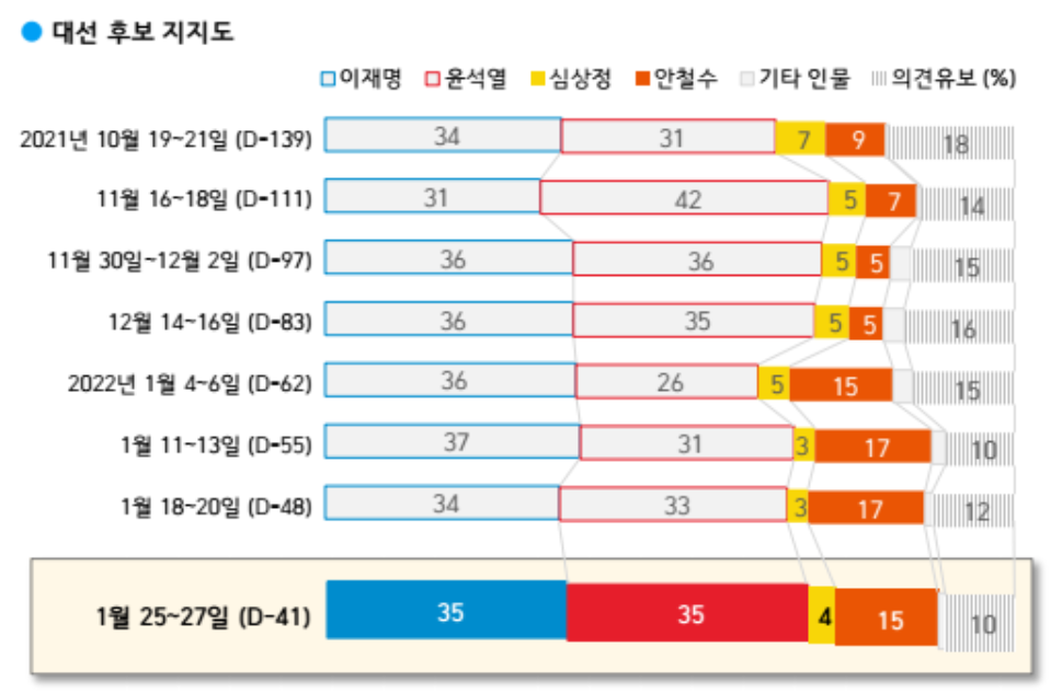 | 2022 대선 후보 TV토론 일정, 1월 JTBC 갤럽 대선 여론조사 지지율 알아보기 (0) | 2022.01.07 |