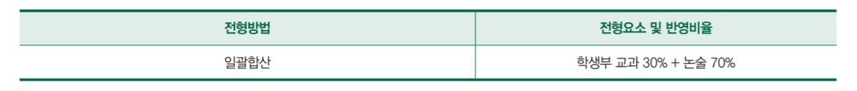 논술전형은 학생부 교과 30%, 논술 70%로 논술의 비중이 높습니다. 계열에 따라 언어논술과 수리논술을 치르며 시험시간은 100분입니다. 수능 최저기준이 있으며 기준은 미래인재전형과 동일합니다.