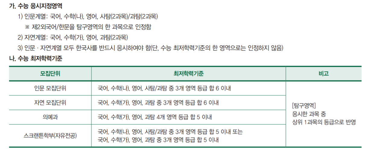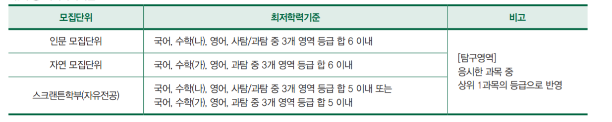 선발 인원이 가장 많은 학생부종합 전형인 미래인재전형은 면접 없이 서류 100%로 심사하며 수능 최저기준이 있습니다. 인문계는 국, 수, 영, 탐(사탐, 과탐) 중 3개 영역의 합이 6 이내여야 하며 자연계는 사탐 제외 과탐까지 포함하여 역시 합이 6 이내입니다. 한국사는 최저 학력기준의 영역은 아니지만 동 전형 지원을 위하여 반드시 응시가 필요합니다. 교과 영역 및 학교 활동 영역에서 자신의 역량을 적극적으로 계발한 노력이 있어야 합니다. 추천서는 폐지되었으므로 필요없으나 자기소개서 입력, 제출은 필수입니다. 자유전공인 스크랜튼학부는 합이 5 이내로 높아집니다.