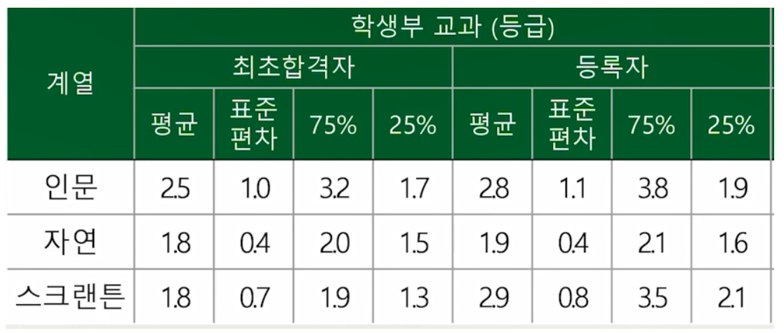 학생부 종합 전형인 미래인재 전형의 평균 수시등급은 인문계 2.8등급, 자연계 1.9등급입니다. 일반고는 1.5~2등급 초반대, 특목고는 3~4등급 중반 정도로 추정됩니다. 논술전형은 인문계는 1.8~5.0, 자연계는 1.9~4.5등급으로 예측하고 있습니다.