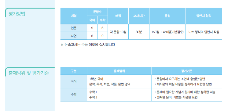 학생부 종합 전형은 학생부 서류 100% 일괄 전형으로 면접은 없습니다. SW 인재 전형은 2단계에서 면접을 실시하며 30% 반영입니다. 논술 우수자 전형은 논술 성적 70%, 교과 성적 30% 비율입니다. 학생부 종합, 논술 우수자 전형은 수능최저학력기준을 적용하지 않습니다. 교과 성적 위주인 학생부 교과 전형은 교과 성적 100% 일괄 반영이며 수능 최저학력기준을 적용합니다. 인문계열은 국어, 수학(확통/미적분/기하), 영어, 탐구(사탐/과탐 중 1개 과목) 중 2개 영역 합 6등급 이내, 자연계열은 국어, 수학(미적분/기하), 영어, 탐구(과탐 중 1개 과목) 중 2개 영역 합 6등급 이내입니다.