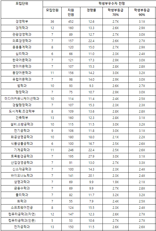 학생부 교과 전형 기준 수시등급을 알아 보겠습니다. 2021년도 최종 등록자 교과 등급 70%컷입니다. 기계공학 3.3, 항공우주공학 2.5, 화학공학 1.9, 고분자공학 2.1, 건축 2.6, 전자공학 1.9, 통계 2.7, 경영 2.6, 아태물류학부(인문) 2.0, 국제통상 3.9, 사회교육 2.1, 행정 2.7, 정치외교 3.1, 경제 2.9, 사회복지 2.8 등입니다.