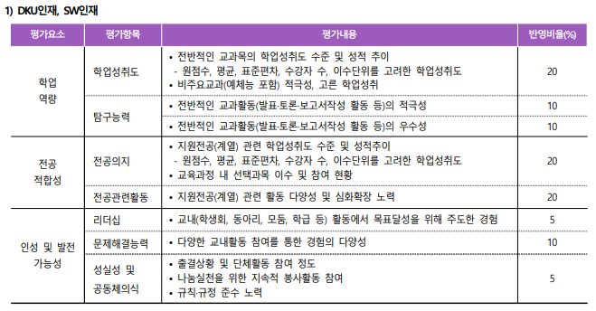 단국대 용인 죽전 캠퍼스 기준으로 확인해 보겠습니다. 주요 전형 선발 인원은 학생부 종합 DKU인재 312명, SW인재 50명, 학생부 교과 지역균형 선발 261명, 논술 우수자 330명, 실기 우수자 209명입니다. 입학원서 접수기간은 9월 12일부터 14일까지입니다. 최초 합격자 발표일은 12월 16일입니다.