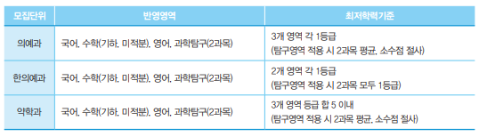 가장 많은 인원을 선발하는 학생부 종합은 수능최저학력기준을 적용하지 않습니다. 인하미래인재(903명)전형은 1단계 서류 평가 100%, 2단계 1단계 70%, 면접 30% 비중으로 선발합니다. 다른 학생부 종합 전형은 전부 서류 100% 선발기준입니다. 지성, 적성, 인성을 종합평가하게 됩니다. 학생부 교과 전형(지역추천인재)은 교과 성적 100% 선발이며 수능최저학력기준이 있습니다. 논술 우수자 전형은 논술 성적 70%, 교과성적 30%이며 수능 최저 학력기준은 의예과만 적용합니다. 학생부 교과는 국내 정규 고등학교에서 통산 3학기 이상의 교육과정을 이수한 졸업(예정)자로서 소속(졸업) 고등학교장의 추천을 받은 자로 추천인원은 계열 구분없이 고교당 7명 이내입니다. 수능최저학력기준은 인문 국어, 수학, 영어, 사회/과학탐구(1과목) 중 2개 영역 합 5등급 이내, 자연계 의예과 외 국어, 수학, 영어, 과학탐구(1과목) 중 2개 영역 합 5등급 이내, 의대는 국어, 수학, 영어, 과학탐구(2과목) 중 3개 영역 각 1등급 이내입니다.
