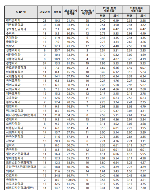 가장 높은 내신등급은 의예과로 평균 1.58, 최저는 2.27등급입니다. 다음으로 자연계에서는 화학공학과 1.96, 생명공학과 1.97입니다. 해당 전공은 최저 등급도 2등급 이내에 들어야 합니다. 인문계열에서는 교육학과가 2.52로 가장 높은데 최저 등급은 6.23까지 있습니다. 다음으로 미디어커뮤니케이션학과의 내신 등급이 2.61등급, 최저 등급은 3.94등급입니다. 본 내신등급은 최종등록자의 내신등급 기준입니다. 1단계 내신등급과 비교해 보는 것도 도움이 될 것이며 평균 내신등급으로 기준을 정하는 것이 안전하겠습니다.