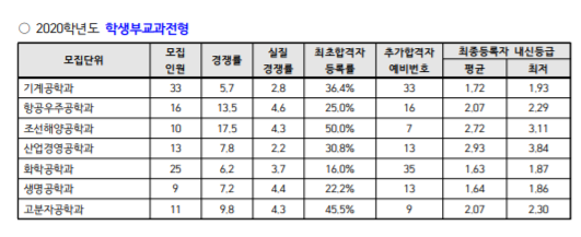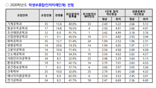 인하대 수시등급, 2020년 전형 결과