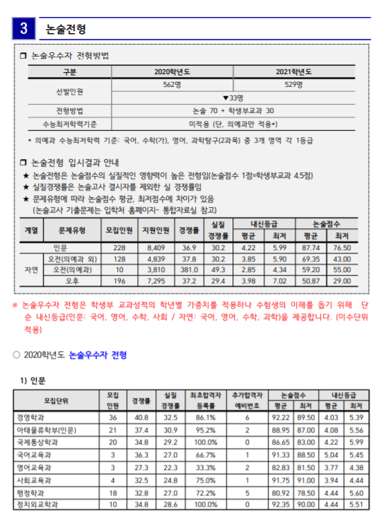 논술전형은 논술점수위 비중이 70%로 높은데 경쟁률은 상대적으로 매우 높은 편입니다. 인문계는 36.9대1로 평균 등급은 4.22 최저 등급은 5.99였습니다. 의예과 제외 자연계는 37.8대1 평균 등급 3.85, 최저 등급 5.90이었습니다. 의예과 경쟁률은 381.0대1 평균 등급 2.85, 최저 등급은 4,34였습니다. 내신 등급이 다소 낮더라도 논술에 자신이 있다면 도전해볼만 하겠습니다. 수능 최저기준은 없습니다. 자세한 전형별 수시등급은 표를 확인하시면 되겠습니다.