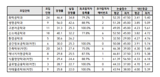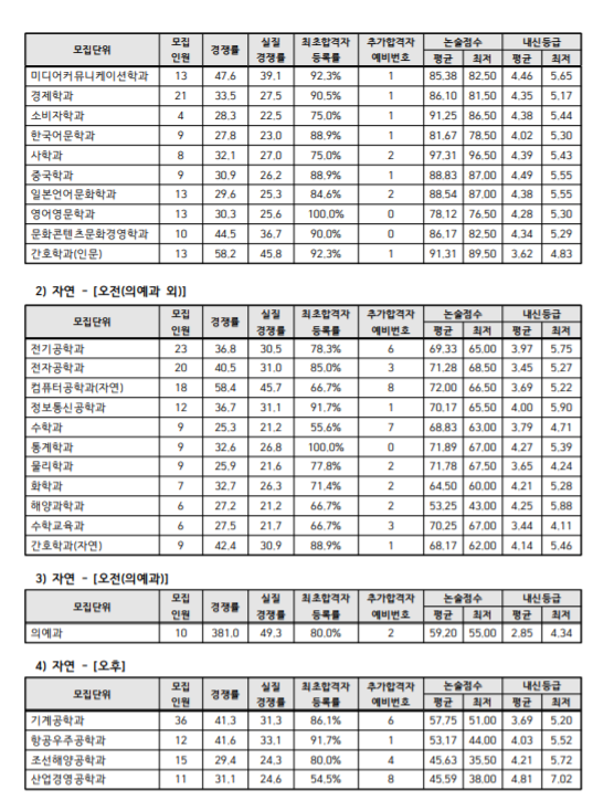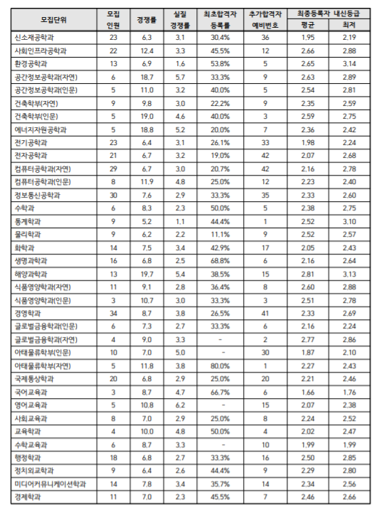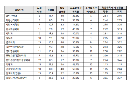 가장 높은 내신등급은 의예과로 평균 1.58, 최저는 2.27등급입니다. 다음으로 자연계에서는 화학공학과 1.96, 생명공학과 1.97입니다. 해당 전공은 최저 등급도 2등급 이내에 들어야 합니다. 인문계열에서는 교육학과가 2.52로 가장 높은데 최저 등급은 6.23까지 있습니다. 다음으로 미디어커뮤니케이션학과의 내신 등급이 2.61등급, 최저 등급은 3.94등급입니다. 본 내신등급은 최종등록자의 내신등급 기준입니다. 1단계 내신등급과 비교해 보는 것도 도움이 될 것이며 평균 내신등급으로 기준을 정하는 것이 안전하겠습니다.