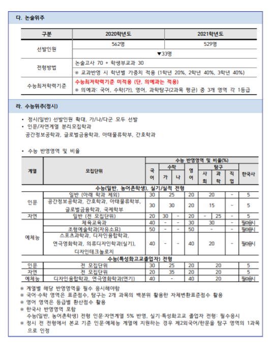 학생부교과는 서류로만 100% 반영하며 수능최저기준이 있습니다. 학생부교과전형으로는 623명을 선발합니다. 논술 전형은 529명을 선발하며 논술 70%, 학생부교과 30%로 전형을 실시하며 의예과를 제외한 나머지 학과는 수능최저기준이 없습니다. 예체능계 대상인 실기 전형은 98명이며 실기 70%, 학생부교과 30%를 봅니다.