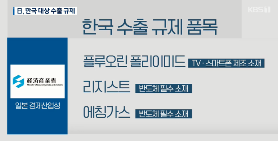 71일 일본정부는 고시를 통하여 한국과의 신뢰 관계가 훼손되었다는 것을 이유로 들며 우리의 주력 산업인 반도체와 디스플레이를 만드는 핵심 소재인 3가지 품목인 플루올린 폴리이미드, 리지스트, 에칭가스 등에 대한 수출 통제를 하겠다고 밝히며 포문을 열었습니다. 한국의 반도체 생산에 필요한 핵심부품들을 못 주겠다는 것으로 한국반도체 산업을 고사시키려는 명백한 경제 압박인 것입니다.