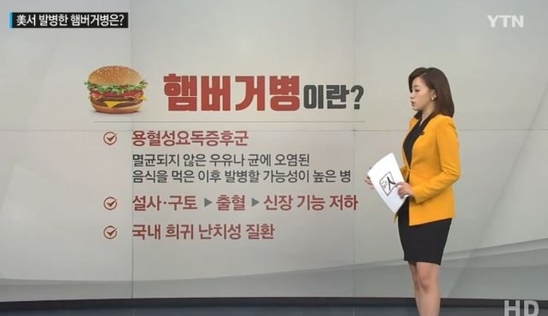 햄버거 병이란 신장이 체내로 들어온 불순물을 제대로 거르지 못하여 독소가 그대로 쌓여 생기는 질환으로 빠른 기간에 신장의 기능을 망가뜨리는 병입니다. 다른 말로는 용혈요독성증후군으로 부르고 있습니다.