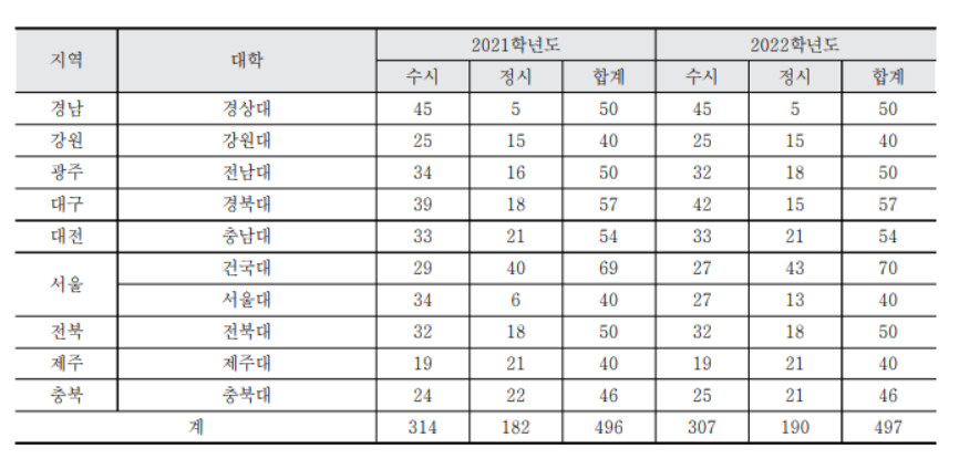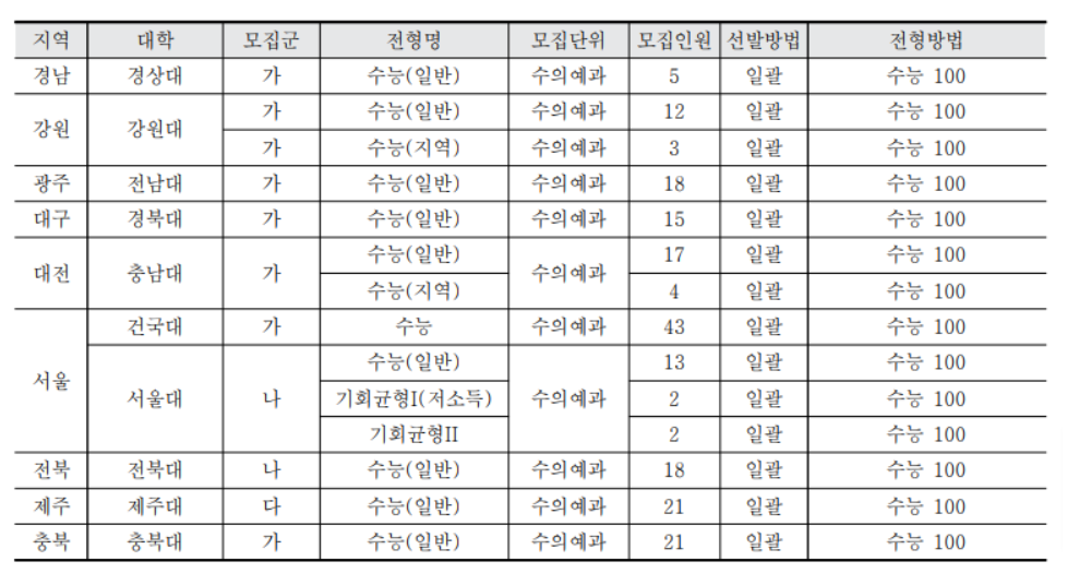 2022학년도 수의학과 모집정원은 정시 190명, 수시 307명으로 497명이며 2021년도 496명과 거의 차이가 없습니다. 서울대는 수시 27, 정시 13명으로 40명, 건국대는 수시 27, 정시 43명으로 70명입니다.